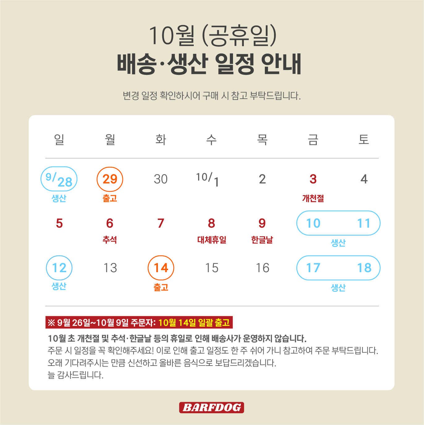 10월 초 개천절 및 추석, 한글날 등의 공휴일로 인해 배송사가 운영되지 않아