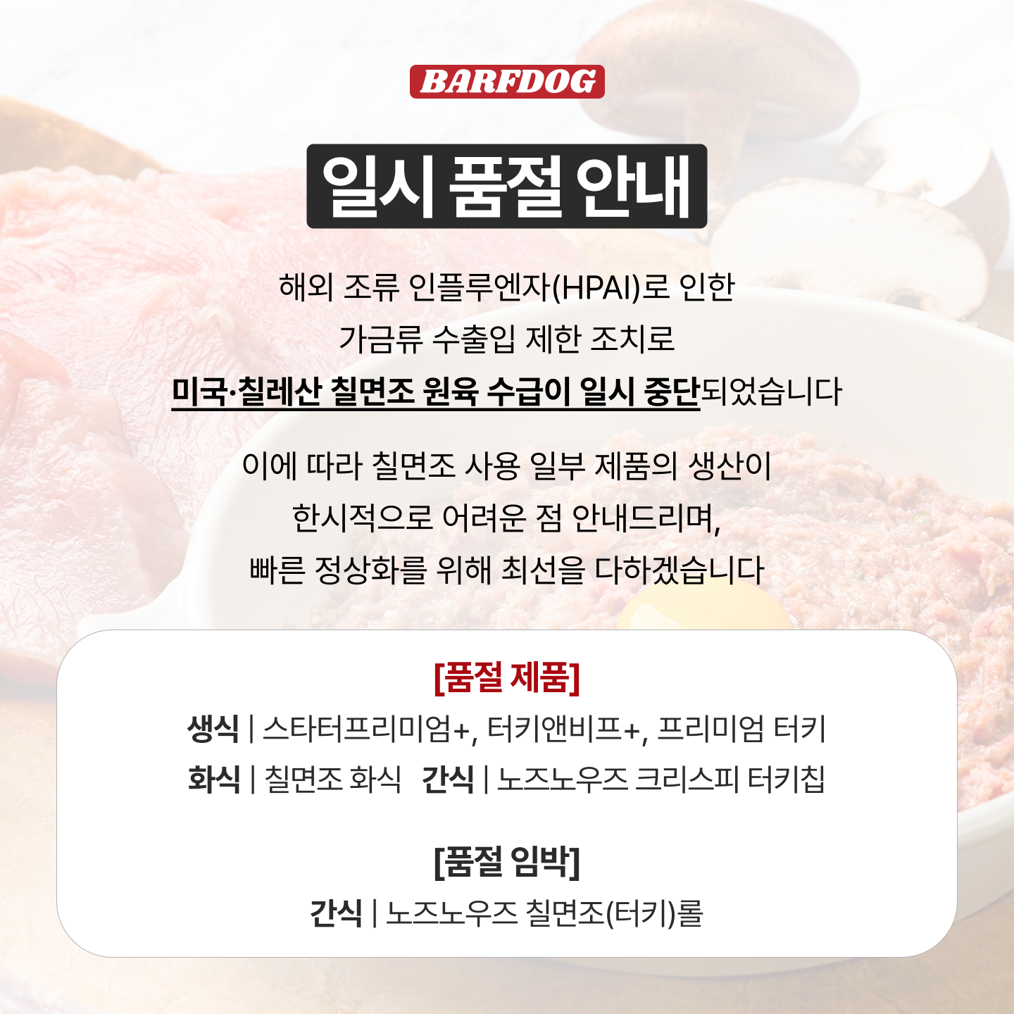현재 바프독이 사용하고 있는 미국·칠레산 칠면조 원육의 수입이 해외 조류 인플루엔자(HPAI) 발생으로 인해 일시적으로 제한된 상황입니다.