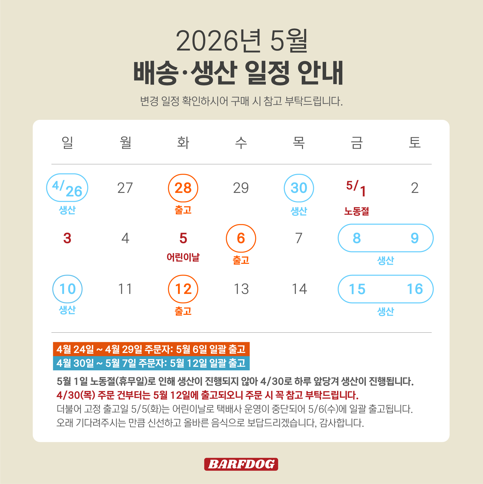 5월 1일(금)이 노동절로 지정됨에 따라 정기 생산이 하루 앞당겨 진행됩니다.