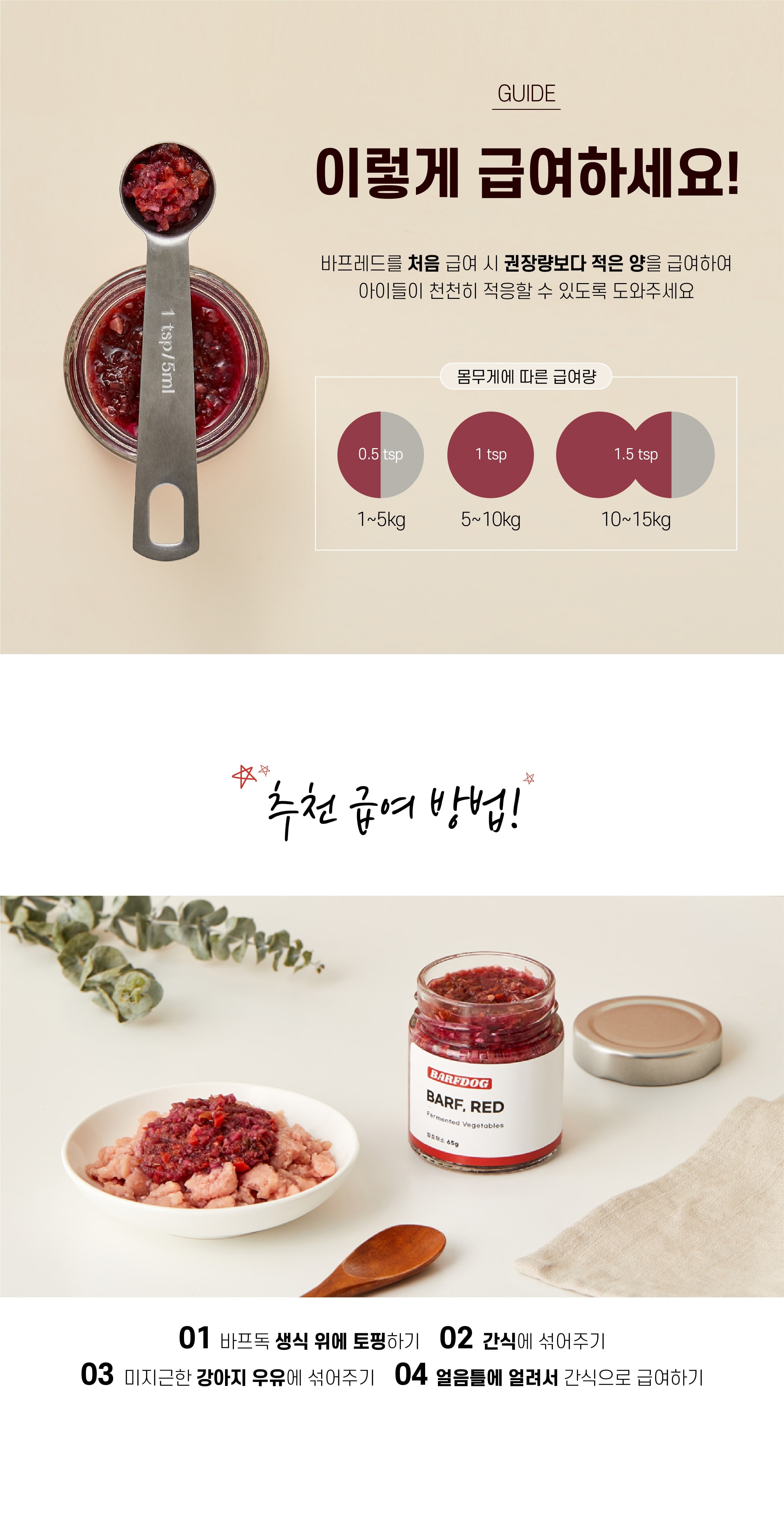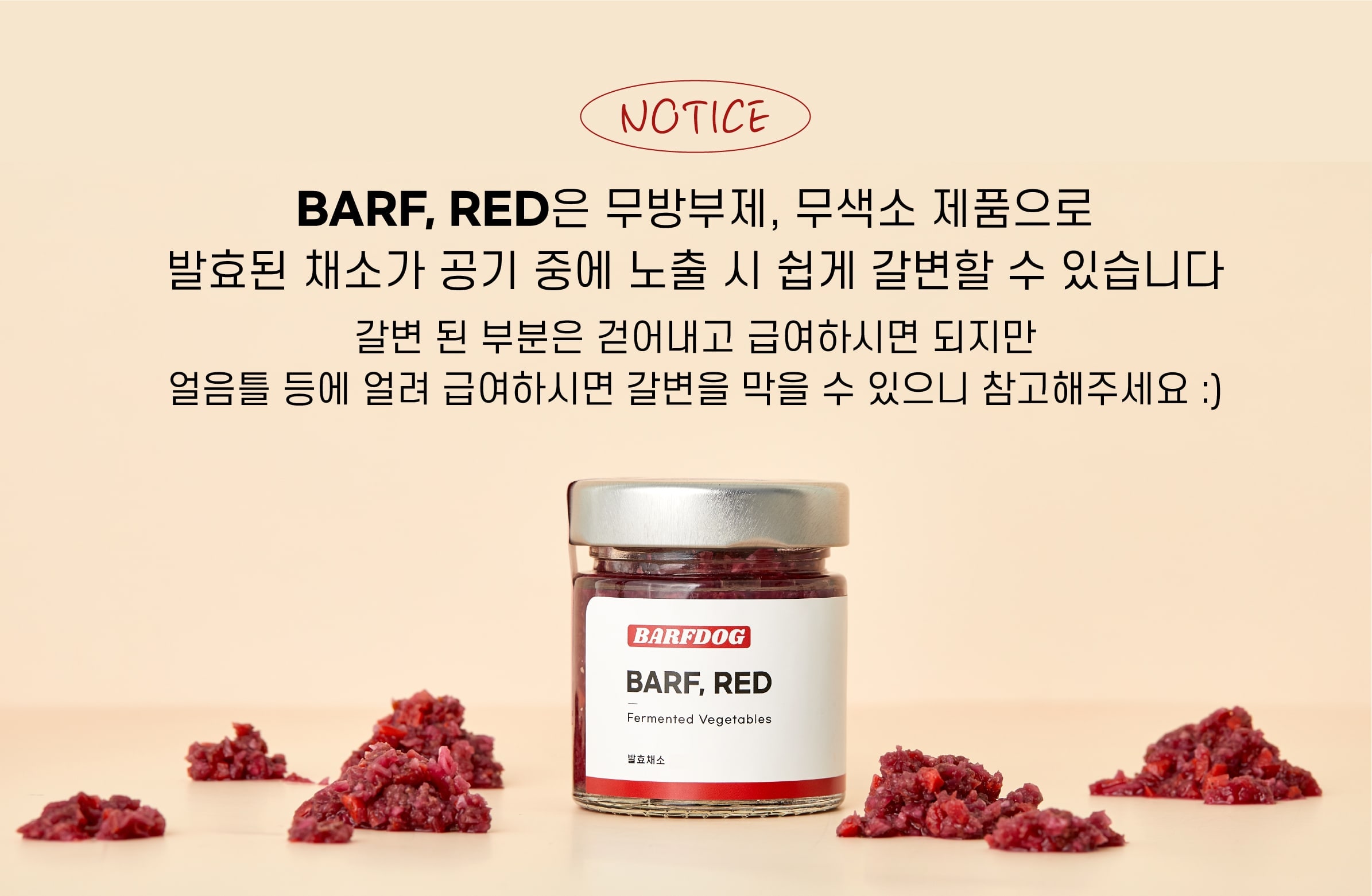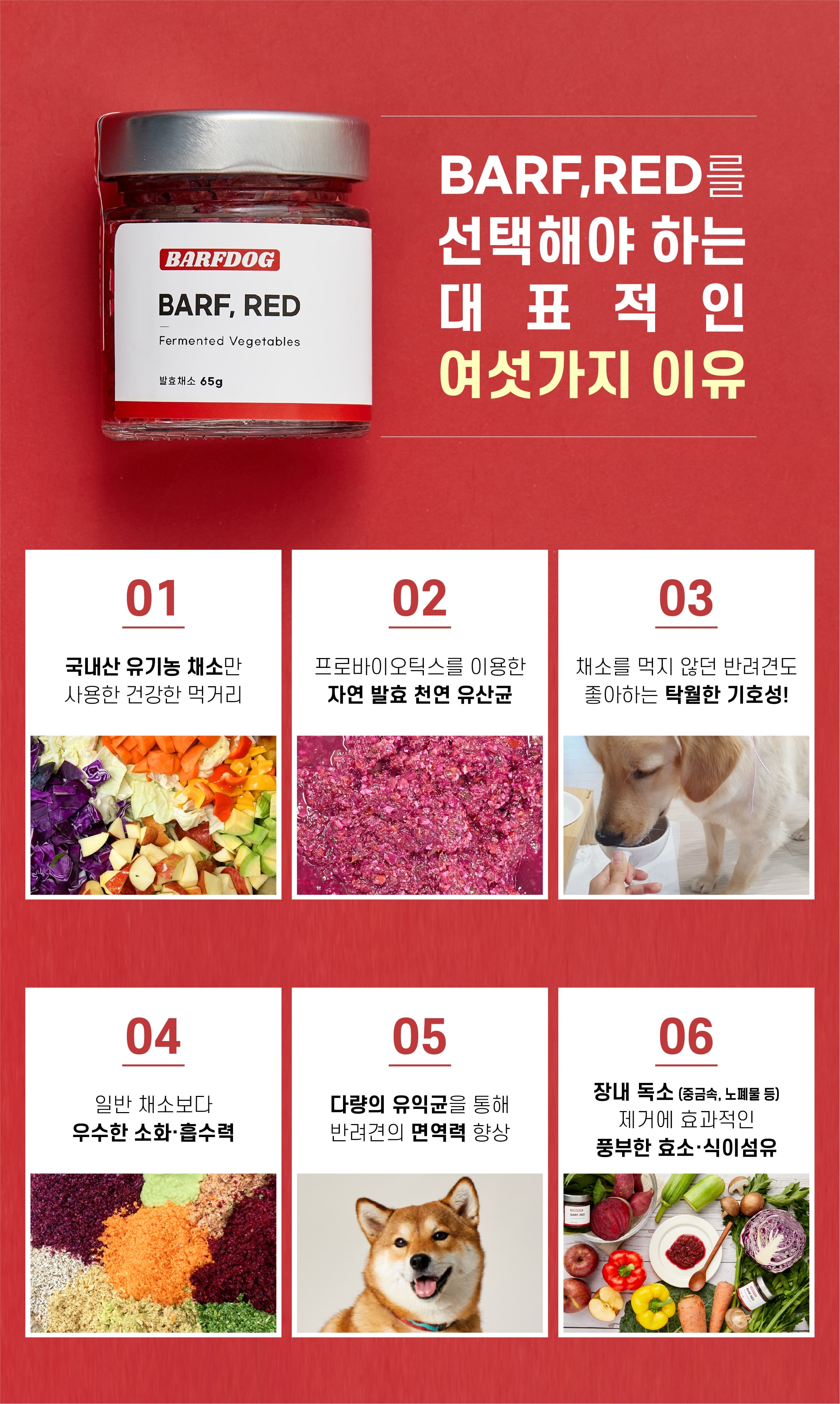 상품 Tip!반려견의 건강한 장 건강을 원하신다면 프로바이오틱스로 건강한 과채소류를 발효시킨 천연 유산균 'BARF,RED'를 급여해보세요. 유익균은 UP 유해균은 DOWN!