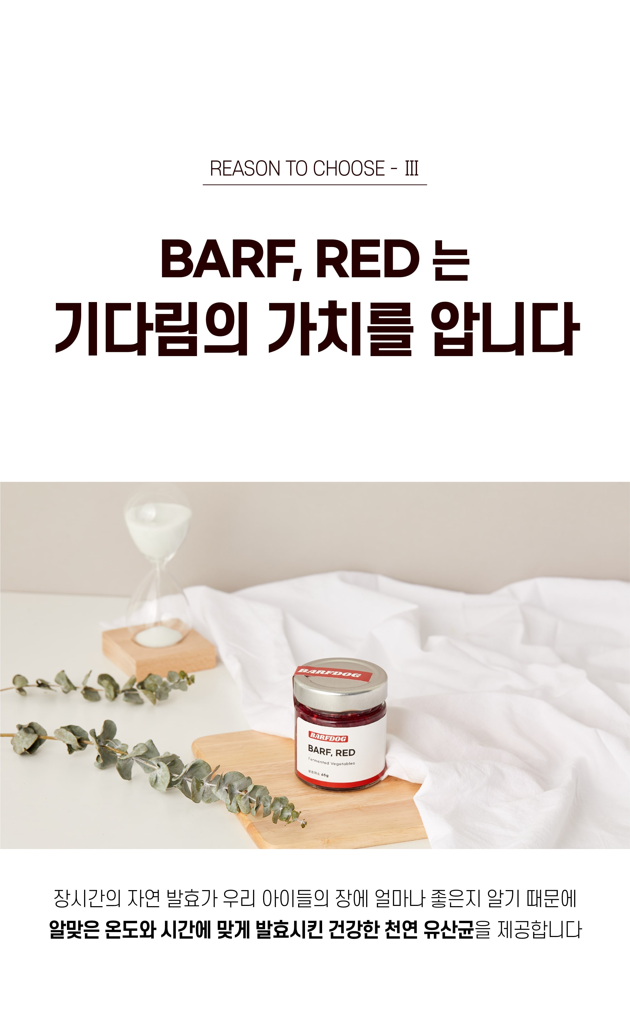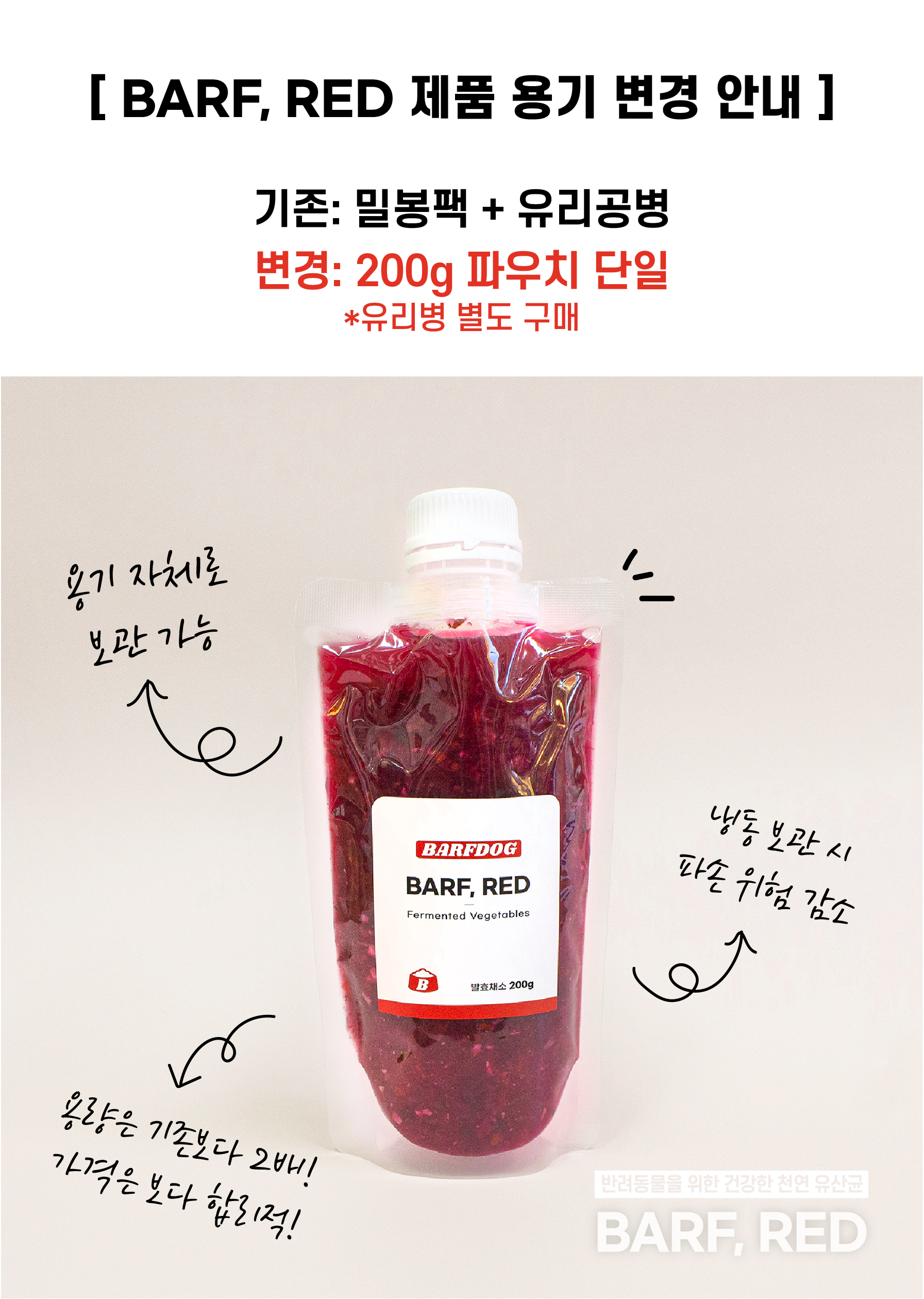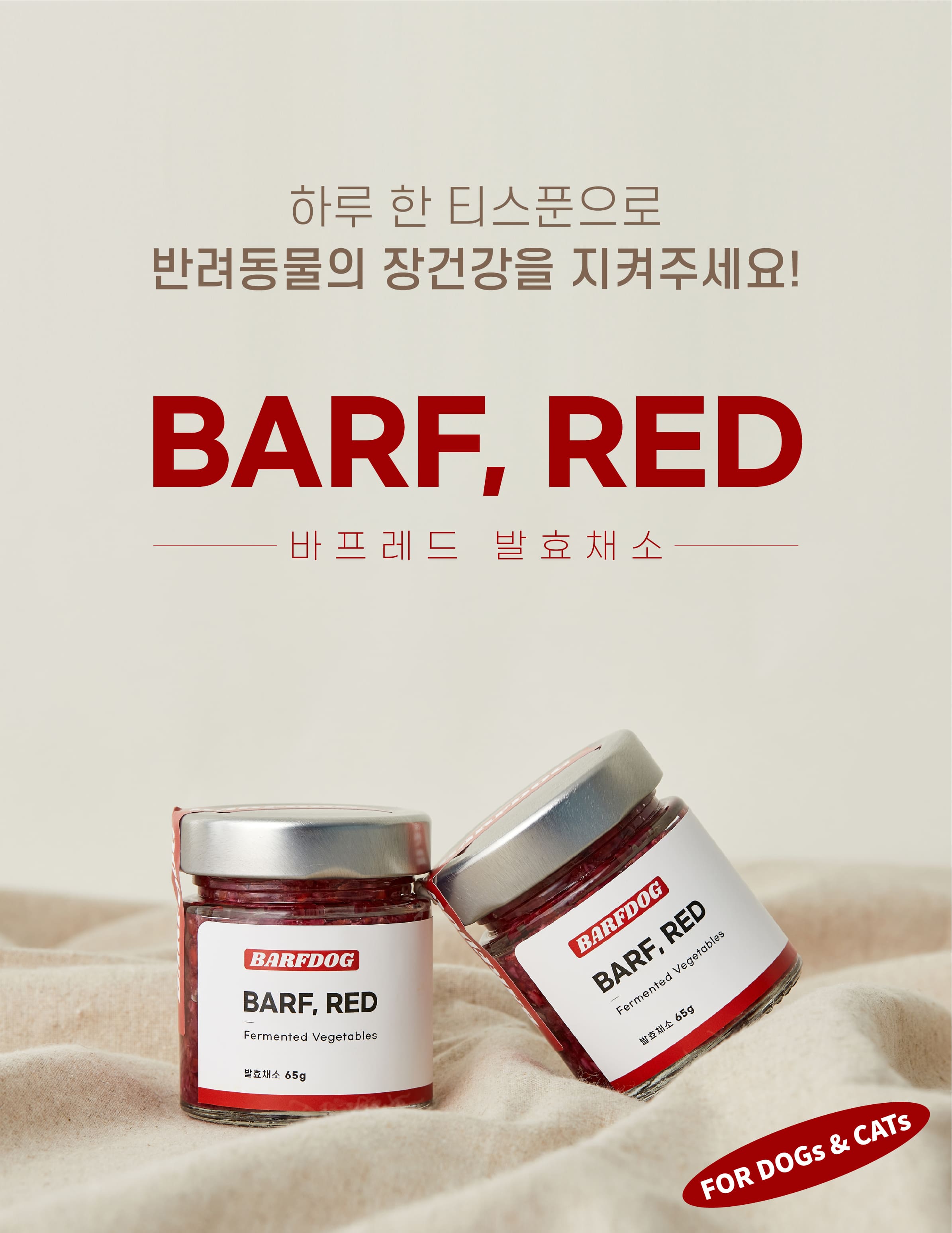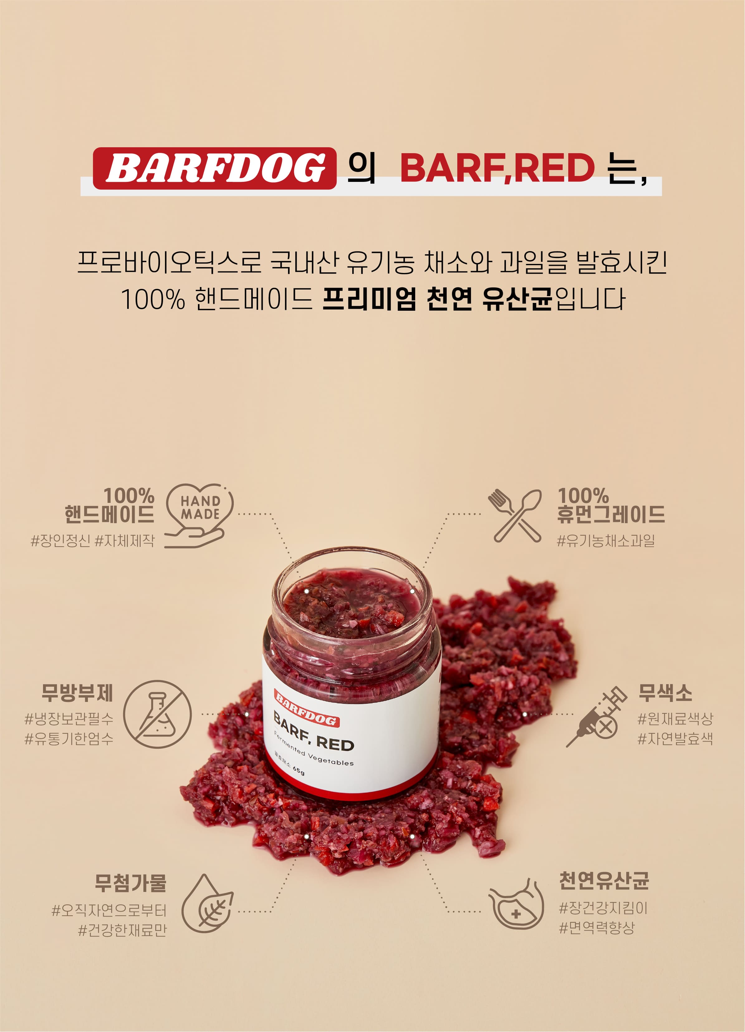 상품 Tip!반려견의 건강한 장 건강을 원하신다면 프로바이오틱스로 건강한 과채소류를 발효시킨 천연 유산균 'BARF,RED'를 급여해보세요. 유익균은 UP 유해균은 DOWN!