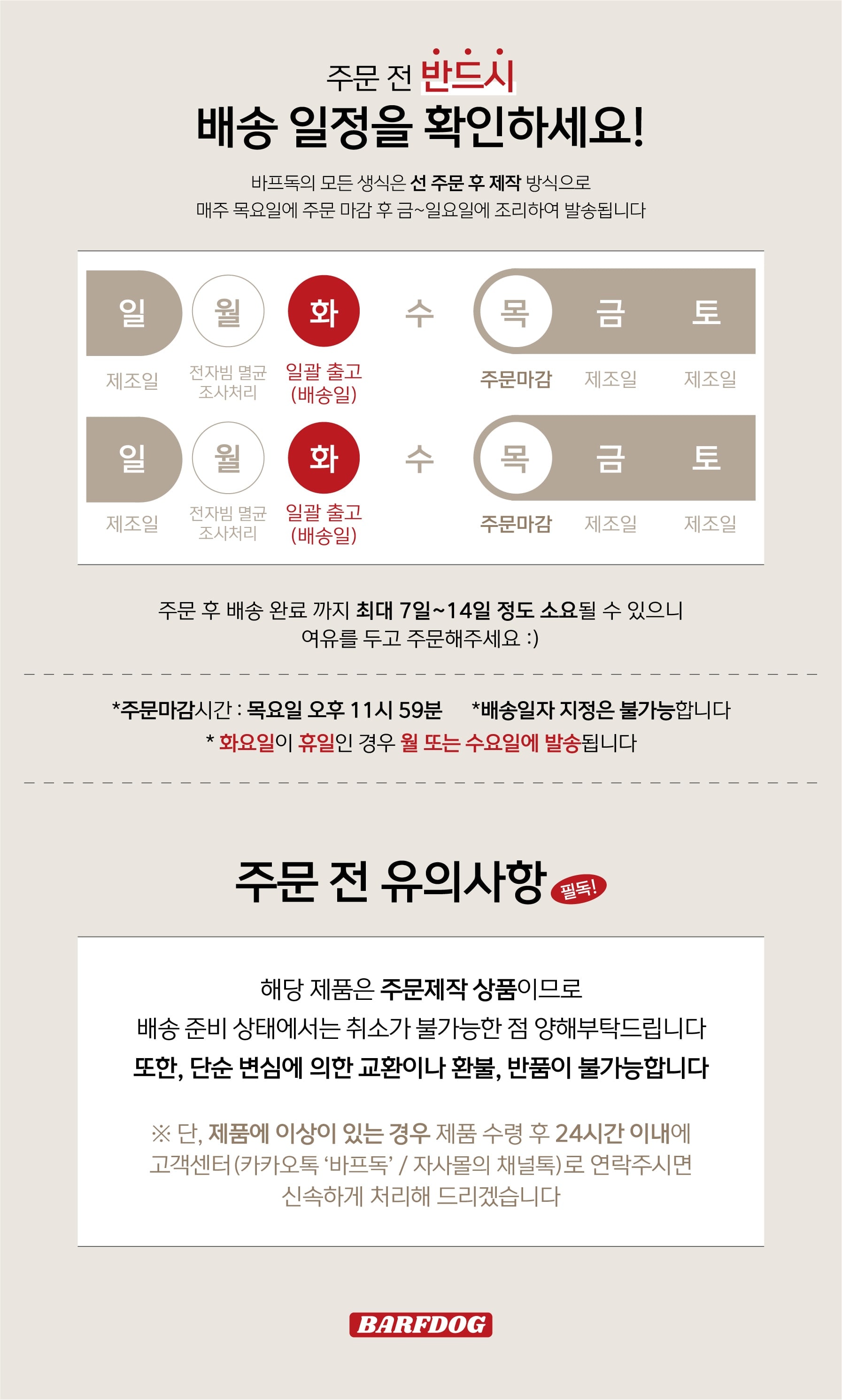 바프독은 항상 목요일 주문마감, 금~일요일에 생산되어 화요일 일괄 배송 됩니다