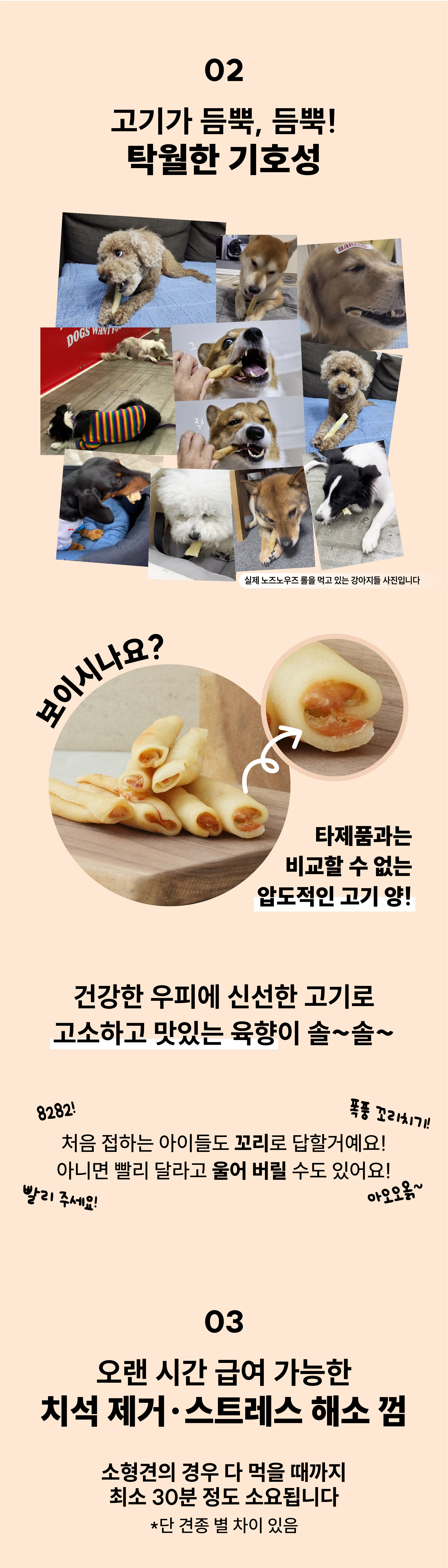 상품 Tip!오래 오래 맛있게 먹을 수 있는 껌을 찾으신다구요? 압도적인 고기 함유량으로 맛있는 냄새 솔솔! 역대급 기호성의 우리 아이 건강한 간식, 만나보세요!