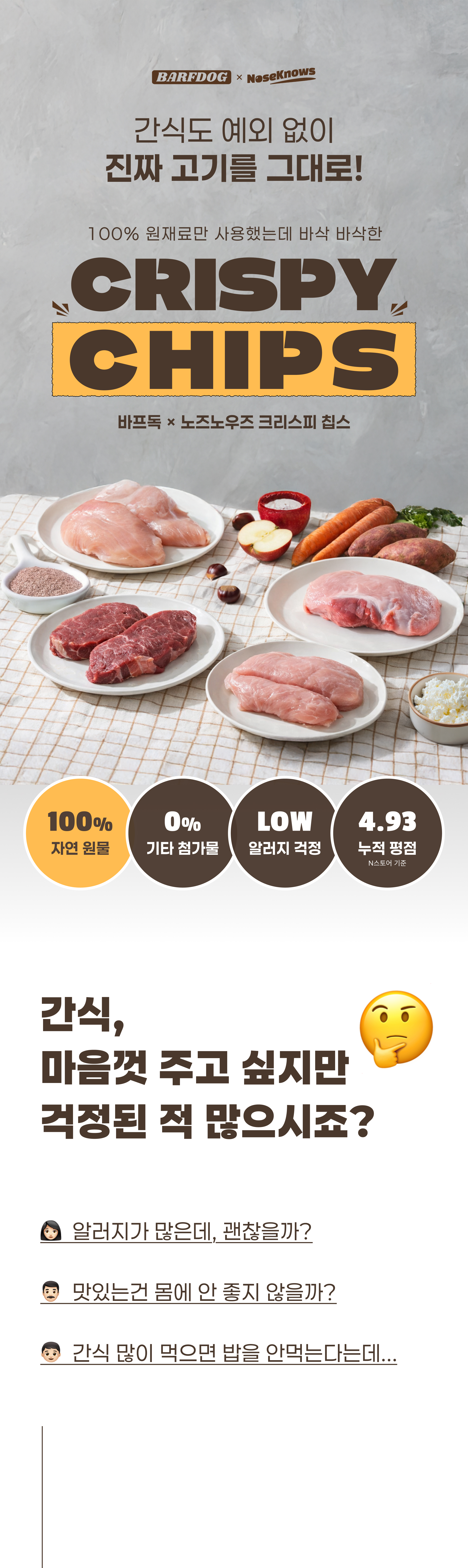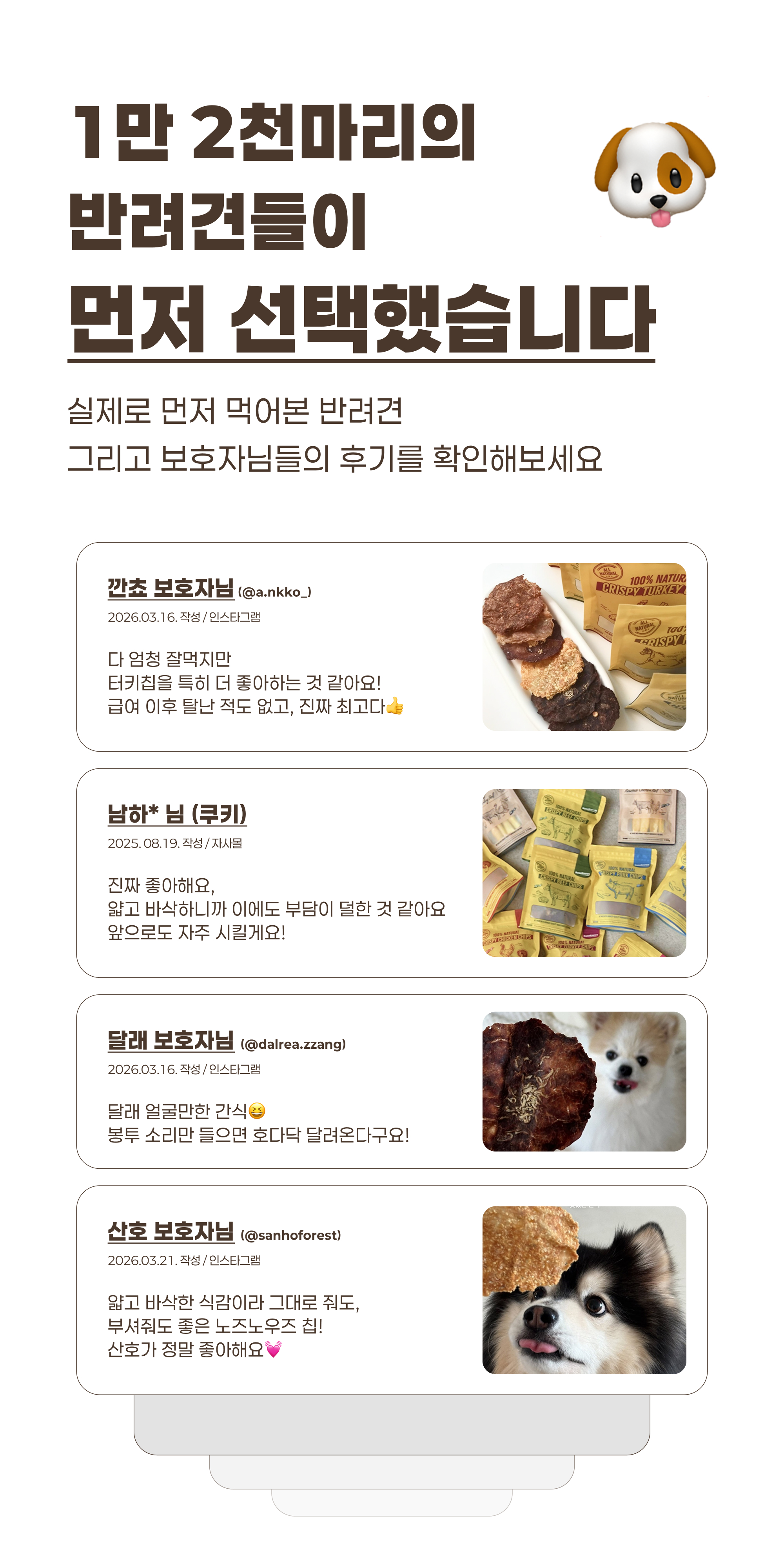 상품 Tip!행복호르몬을 가득 담은 '칠면조' 고기로 만든 바삭한 칩을 만나보세요! 얇고 바삭해 손으로 부셔 노즈워크용으로 사용하거나 보상 간식으로도 적합합니다?