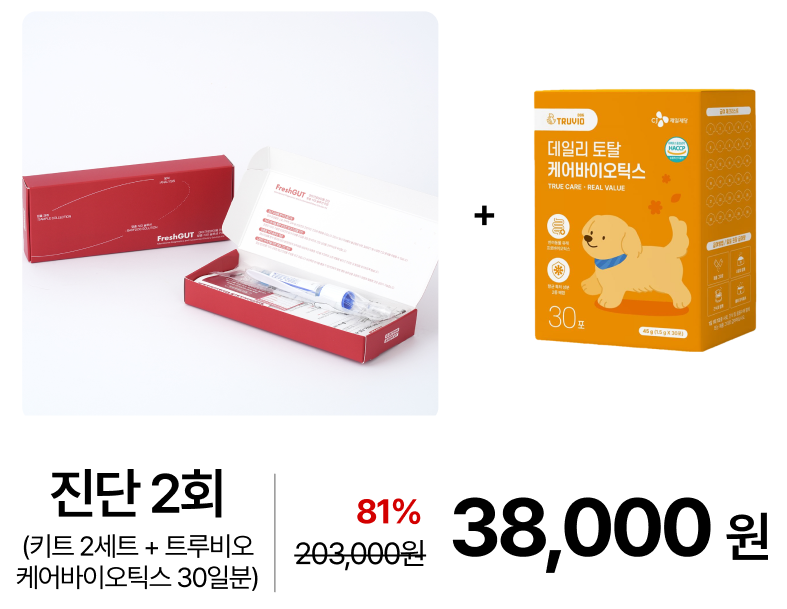 상품 Tip![CJ제일제당 트루비오와의 협업 특가 상품입니다] 바프독 프레쉬것 진단키트 2회 + CJ제일제당 트루비오의 케어바이오틱스 30일분